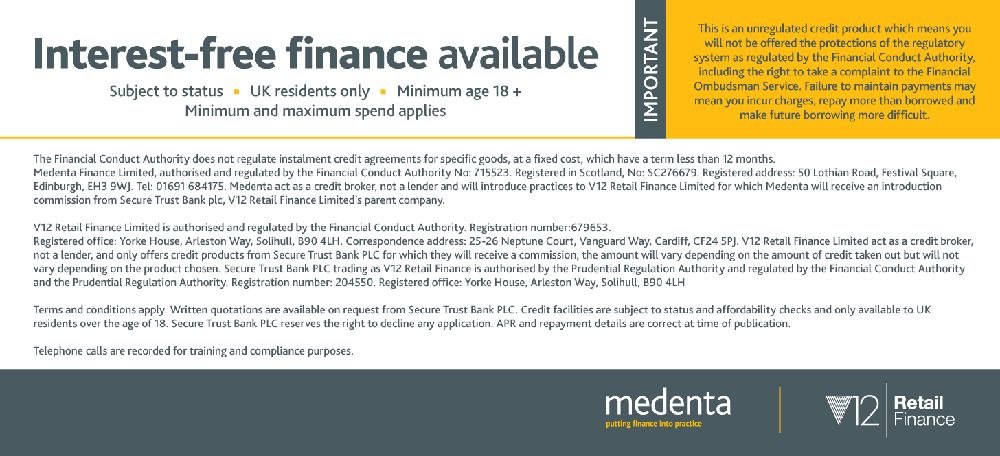 V12 Retail Finance Limited is authorised and regulated by the Financial Conduct Authority. Registration number:679653. Registered office: Yorke House, Arleston Way, Solihull, B90 4LH. Correspondence address: 25-26 Neptune Court, Vanguard Way, Cardiff, CF24 5PJ. V12 Retail Finance Limited act as a credit broker, not a lender, and only offers credit products from Secure Trust Bank PLC for which they will receive a commission, the amount will vary depending on the amount of credit taken out but will not vary depending on the product chosen. Secure Trust Bank PLC trading as V12 Retail Finance is authorised by the Prudential Regulation Authority and regulated by the Financial Conduct Authority and the Prudential Regulation Authority. Registration number: 204550. Registered office: Yorke House, Arleston Way, Solihull, B90 4LH.